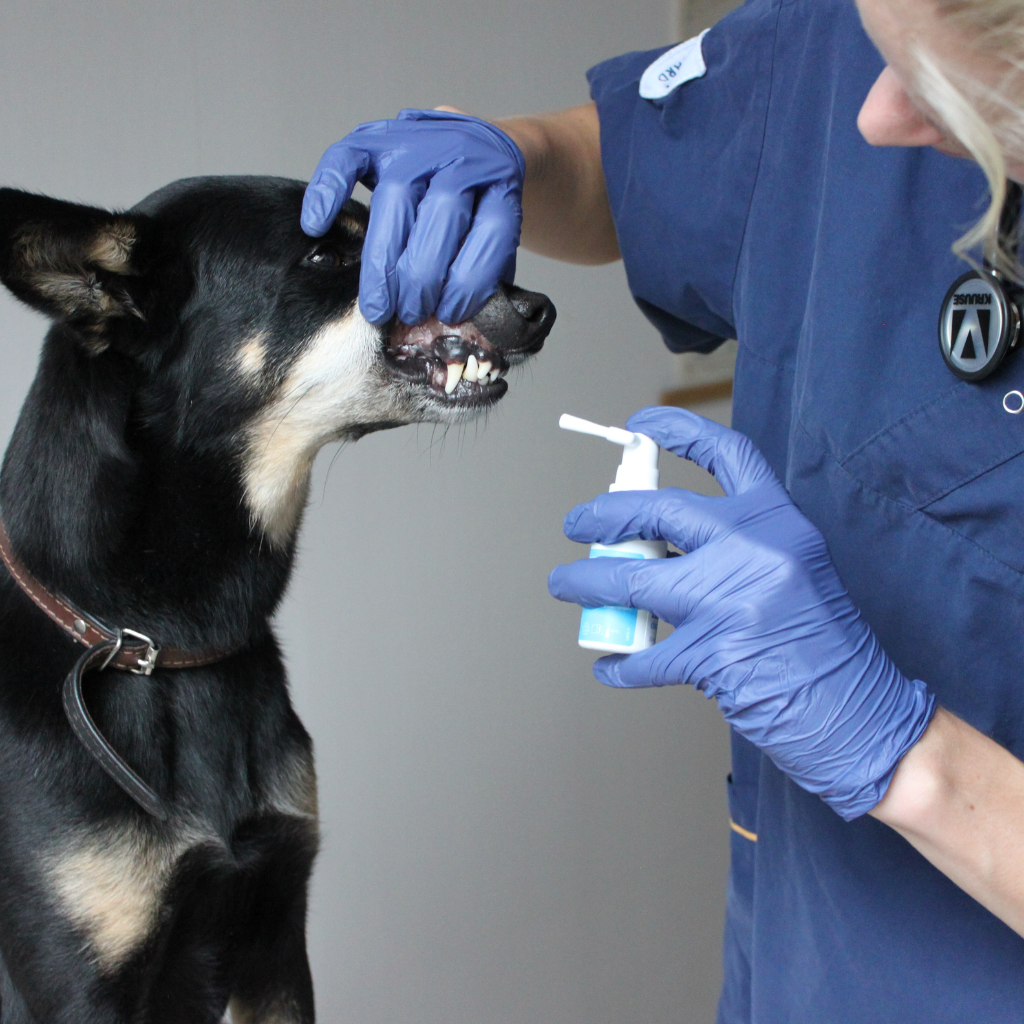 Lyft försiktigt överläppen på djuret med en hand. Håll spraymunstycket 2-5 cm från djurets tänder och tandkött och spraya försiktigt över hela tänderna och tandköttsområdet.